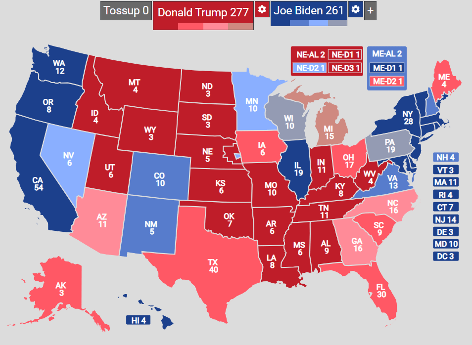 The above image (made with YAPMS) shows an aggregate of polls recently taken in various states; it shows a 16 electoral college vote lead for Trump, though this could easily flip to a Biden victory if polling in Michigan is off by even half a percent.
